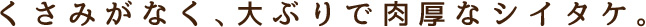 いのもと園のシイタケは、傘が大きく、肉厚。 くさみもなく子供でも食べやすいと評判です。 水気が少ないところも特徴で、暗くて涼しいところで保管すれば、日持ちもします。